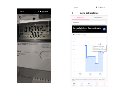 Deinen Verbrauch kannst du jetzt jederzeit checken, indem du ganz einfach mit der App deinen Zählerstand scannst und automatisch deinen Verbrauch angezeigt bekommst.