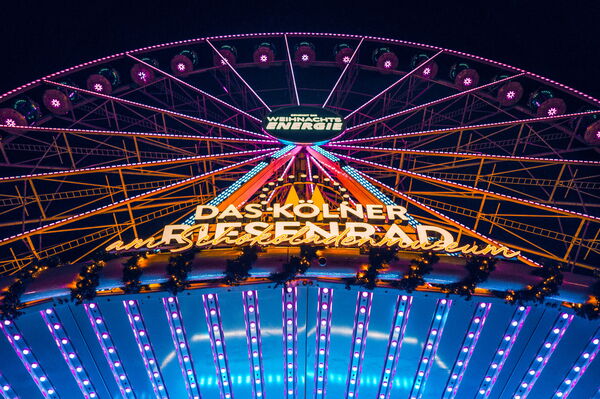 - Das Riesenrad auf dem Hafen-Weihnachtsmarkt am Schokoladenmuseum wird in den Farben von E WIE EINFACH zum Markenerlebnis