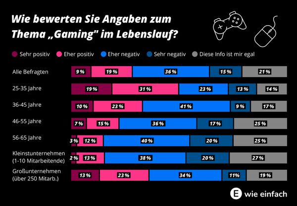 Wer ganz am Anfang des Arbeitslebens steht, kann noch nicht mit Berufserfahrung punkten. Stattdessen setzen gerade junge Bewerber:innen auf Hobbys und Interessen, um ihre Lebensläufe aussagekräftiger und auf mögliche Soft-Skills aufmerksam zu machen. Doch nicht jedes Hobby erweckt einen gleichermaßen guten Eindruck: Nur ein Viertel der Befragten (28%) gab an, Gaming positiv im Lebenslauf zu bewerten. Über die Hälfte (51%) steht dem Hobby dagegen generell negativ gegenüber, 15 Prozent sogar sehr negativ.